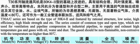 T30C型玻璃鋼外接式軸流通風(fēng)機(jī)具有結(jié)構(gòu)合理、設(shè)計簡單、靜壓及效率高、防腐性能良好、噪音低、運(yùn)轉(zhuǎn)平穩(wěn)、機(jī)械振動小、氣流順暢等特點(diǎn)。該系列風(fēng)機(jī)電機(jī)裝配在風(fēng)機(jī)筒體上部,有可調(diào)的電機(jī)支承座板,采用角帶傳動,從而使風(fēng)機(jī)所輸送的各種耐腐性氣體與電機(jī)隔離,保證電機(jī)使用壽命。風(fēng)筒內(nèi)采用外溝球面萬向軸承座,具有體積小、密封性能好等到優(yōu)點(diǎn)。該系列風(fēng)機(jī)主要適用于一般工業(yè)管道串聯(lián)加壓、送風(fēng)及排氣使用。所輸送氣體不允許含有粘性物質(zhì)、所含粉塵及硬質(zhì)顆粒≤150mg/m3、氣體溫度≤60℃、相對濕度≤100%。